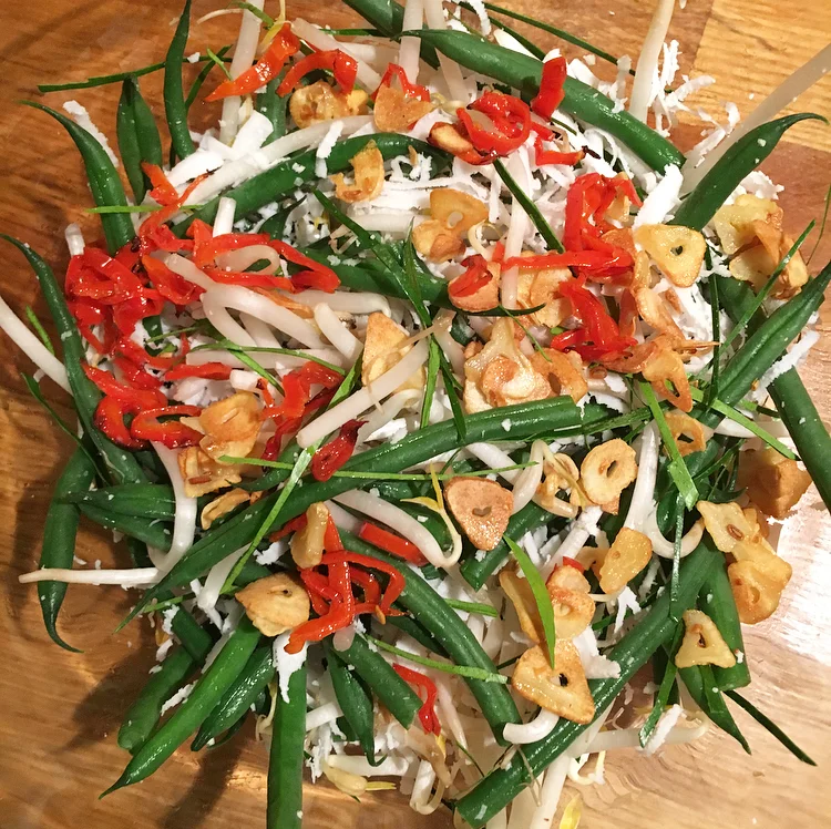 Tip the blanched beans into a bowl and add the grated coconut, bean sprouts, shredded lime leaves, fried shallots, fried garlic fried chillies and uncooked red chillies. Mix well, then drizzle over the salad dressing and toss everything together.